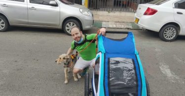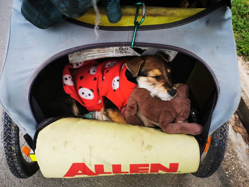 “Peljal sem jo k veterinarju, ki ji je dal antibiotike … Skupaj sva preživela dan, potem sem pa razmišljal, kaj naj zdaj z njo – če jo vrnem nazaj na cesto, verjetno ne bo preživela….” In tako se mu je po približno 10.000 prehojenih kilometrih, pridružila na poti.