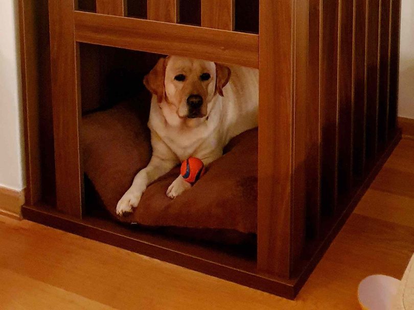 Kako se je začelo? Doma so imeli kupljeno kovinsko kletko, v kateri je labradorka spala. Ker so si zaželeli leseno, jo je Tomaž izdelal kar sam. Kupil je iverne plošče, prevlečene z melaminom (podobne uporabljajo za omarice npr. v Ikei, pove. Razrezali so mu jih v lokalni mizarski delavnici.