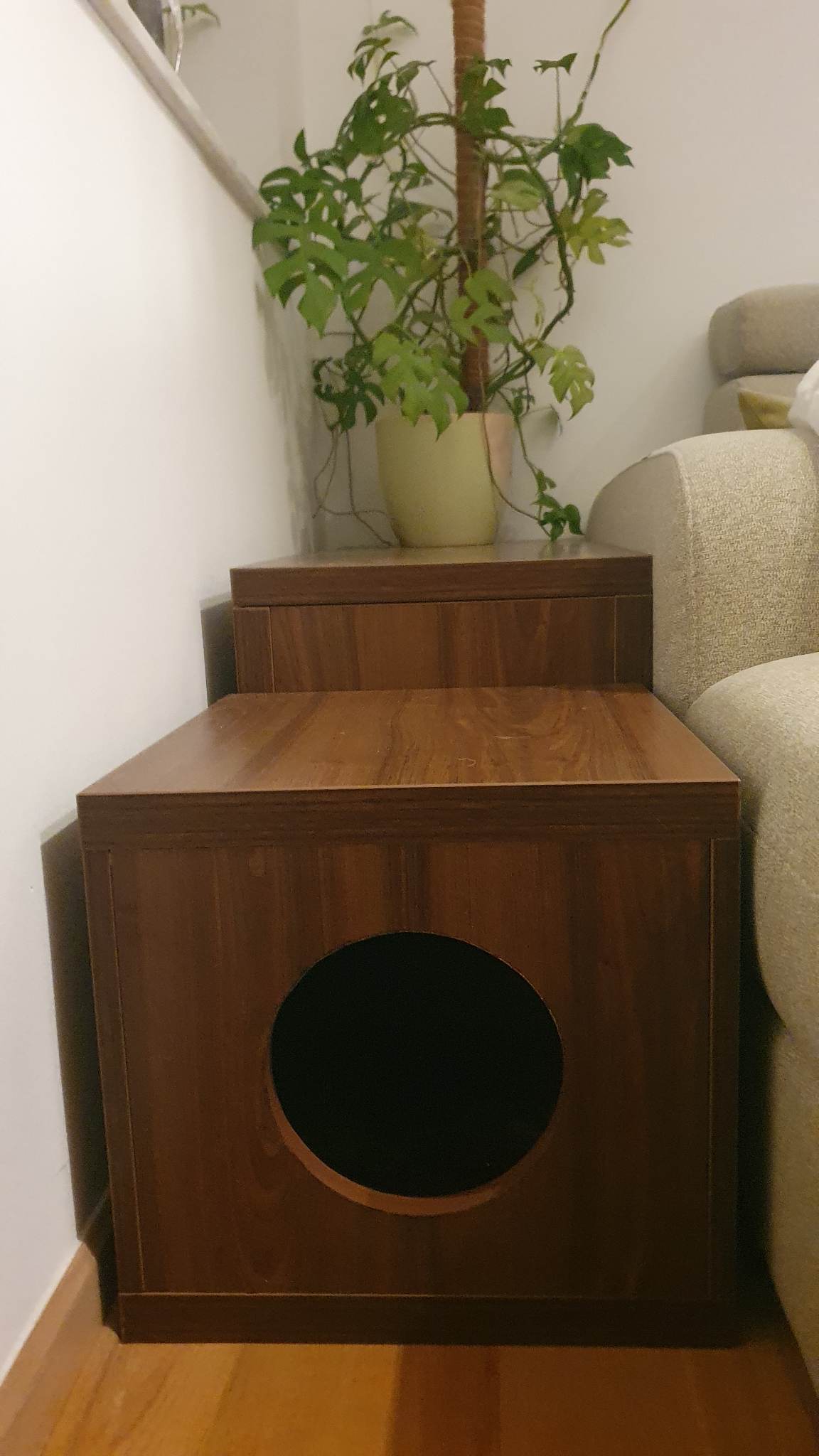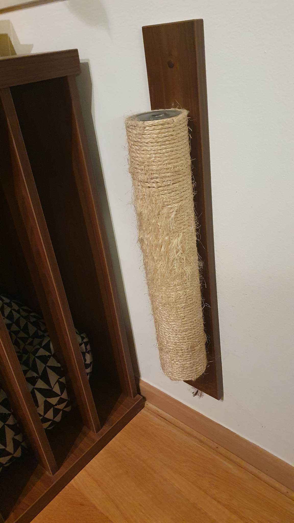 Od izdelave hiške je izdelal še manjšo hiško – votlino za mačko in praskalnik zanjo.