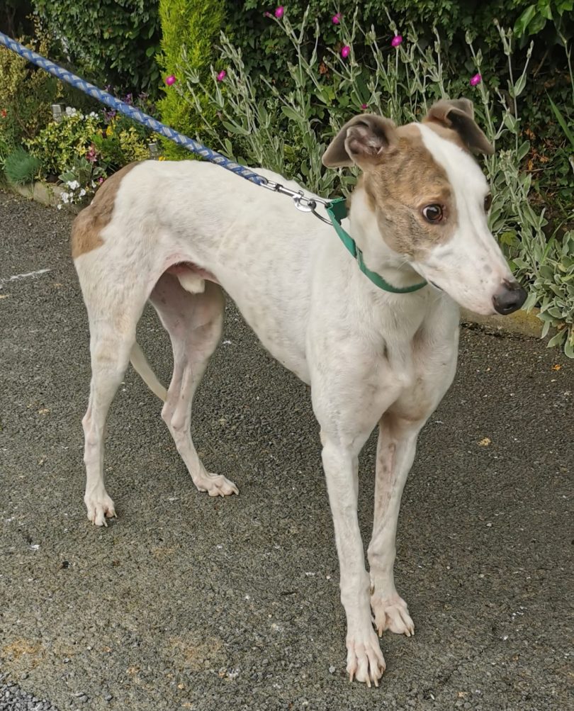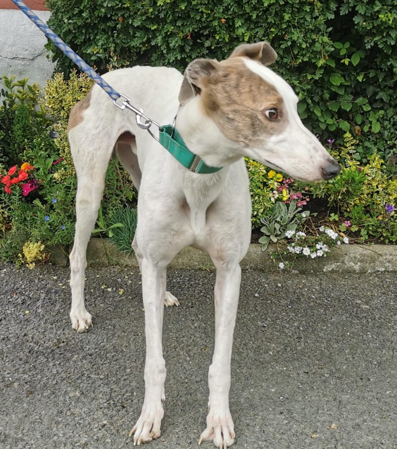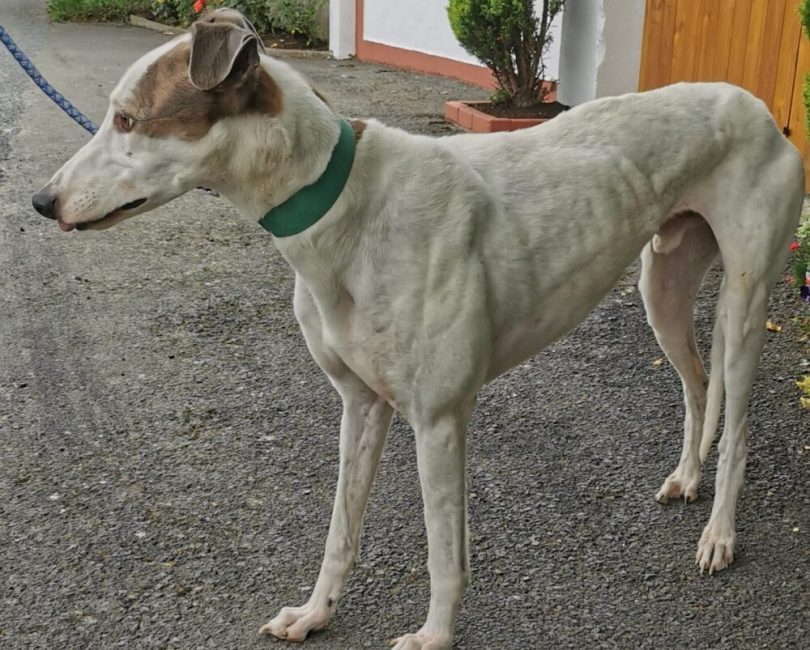 Liam je res velik greyhound bele barve z nekaj brindle ožigi po telesu. Star je 6 let in ima žalostno, a žal tipično preteklost.