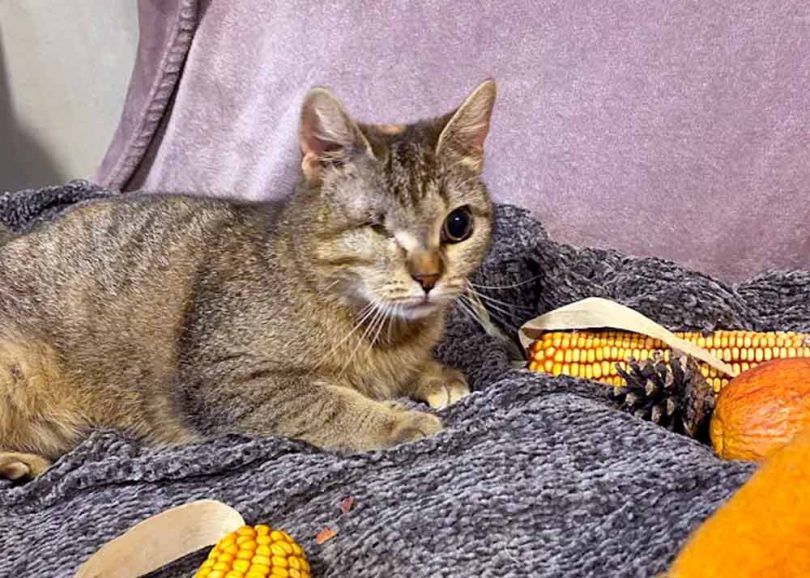 Helga je odrasla slepa mucka, ki je primerna izključno za notranje bivanje.