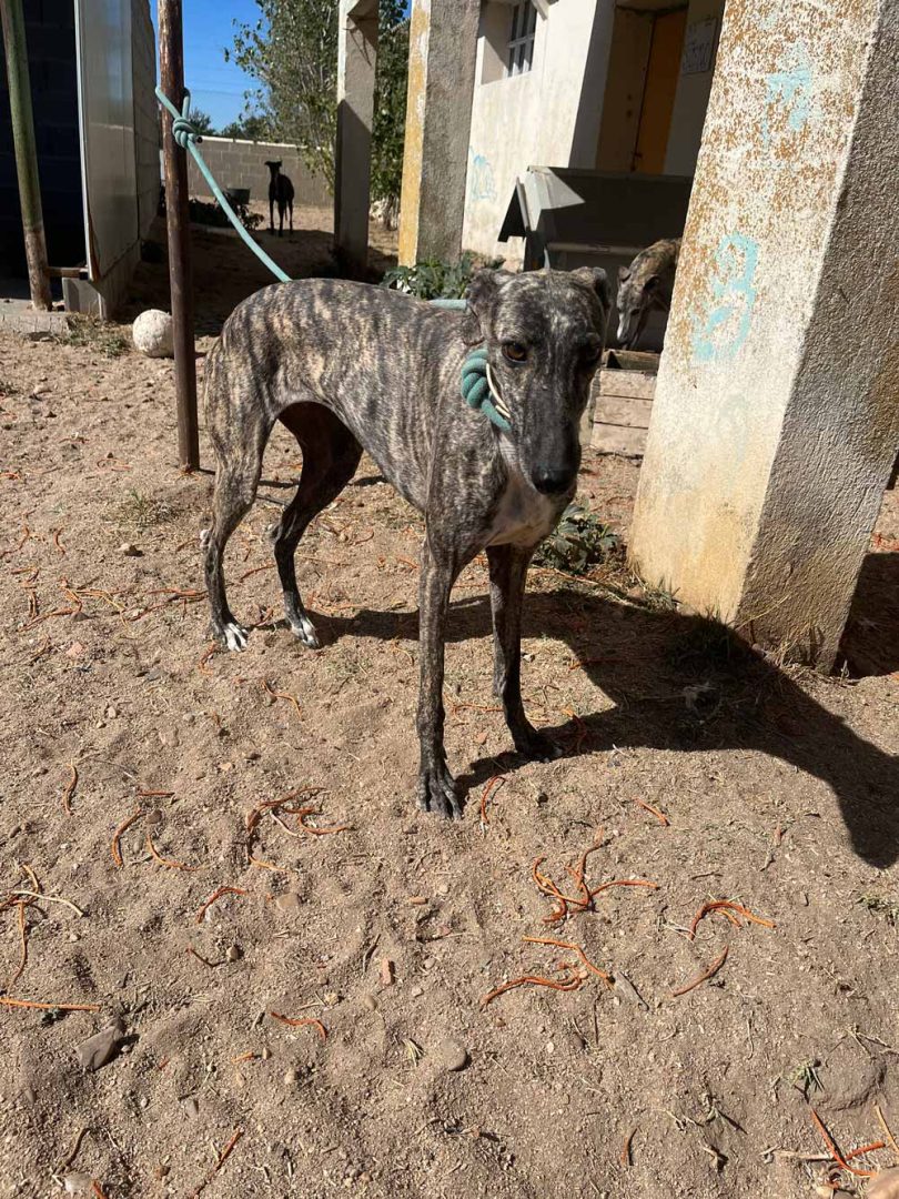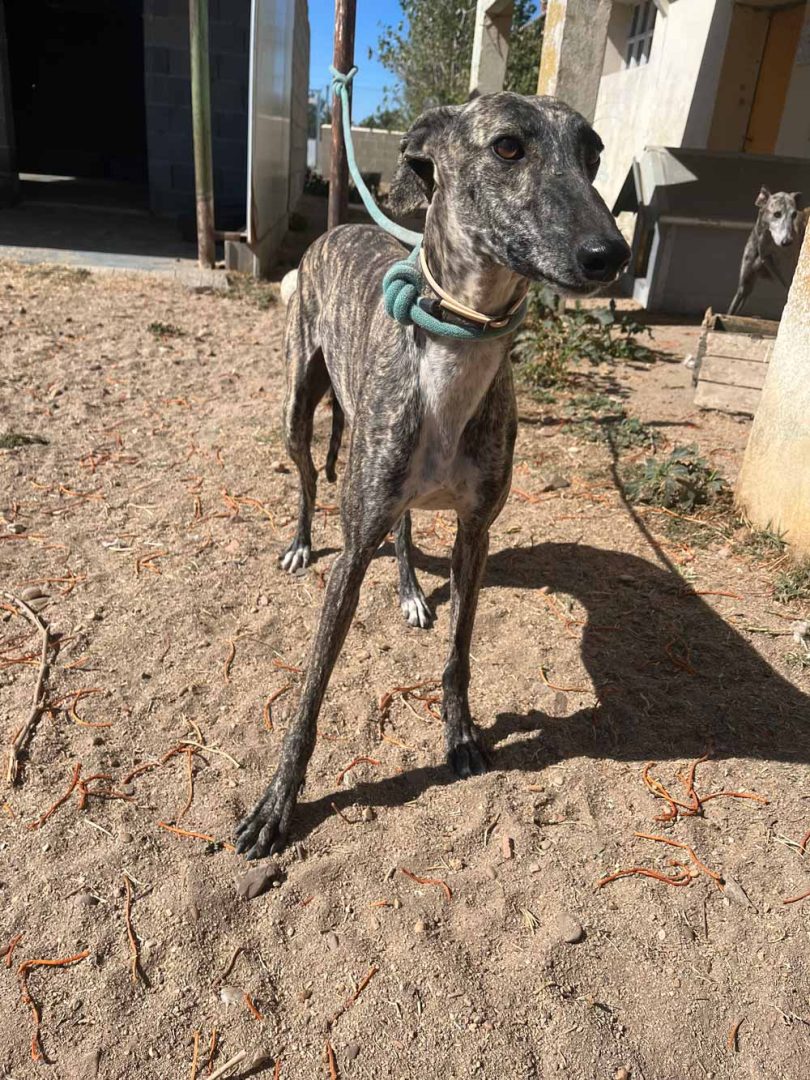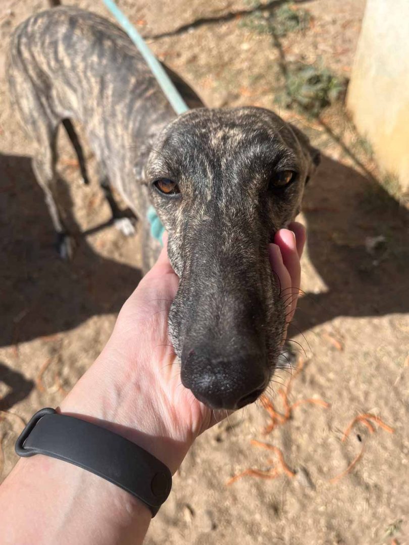 Je vesela, radovedna in simpatična galgina, ki je vesela vseh prostovoljcev, ki jo pridejo obiskat. Veselo odteče kakšen krog po ogradi, potem pa se nasloni nate in uživa v božanju ter poskuša zlesti v naročje.