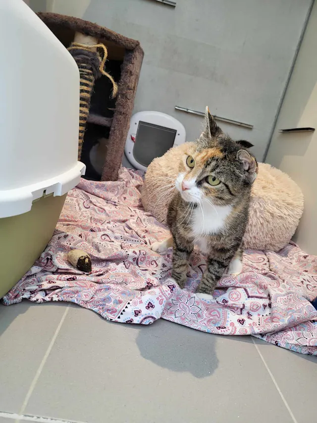 Flekica je odrasla mucica, ki je prišla v zavetišče z zlomljeno tačko in vrsto drugih zdravstvenih problemov.