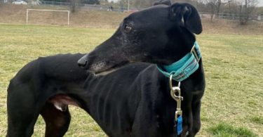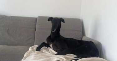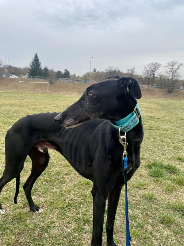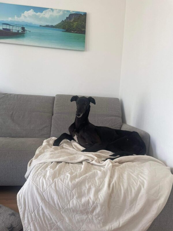 V začasnem domu se v družbi veselega lurcherja Bluja počasi sprošča in že uživa v pozornosti svoje začasne skrbnice, pride do nje in nežno zahteva božanje.