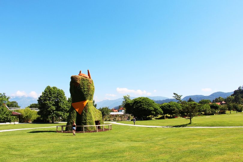 ”Vhod Arboretuma pazi prav poseben cvetlični pes čuvaj, ki s prijetno zelenim kožuščkom prav ljubko počiva na travniku in pozdravlja obiskovalce parka. S svojimi 8 metri višine je zagotovo največji