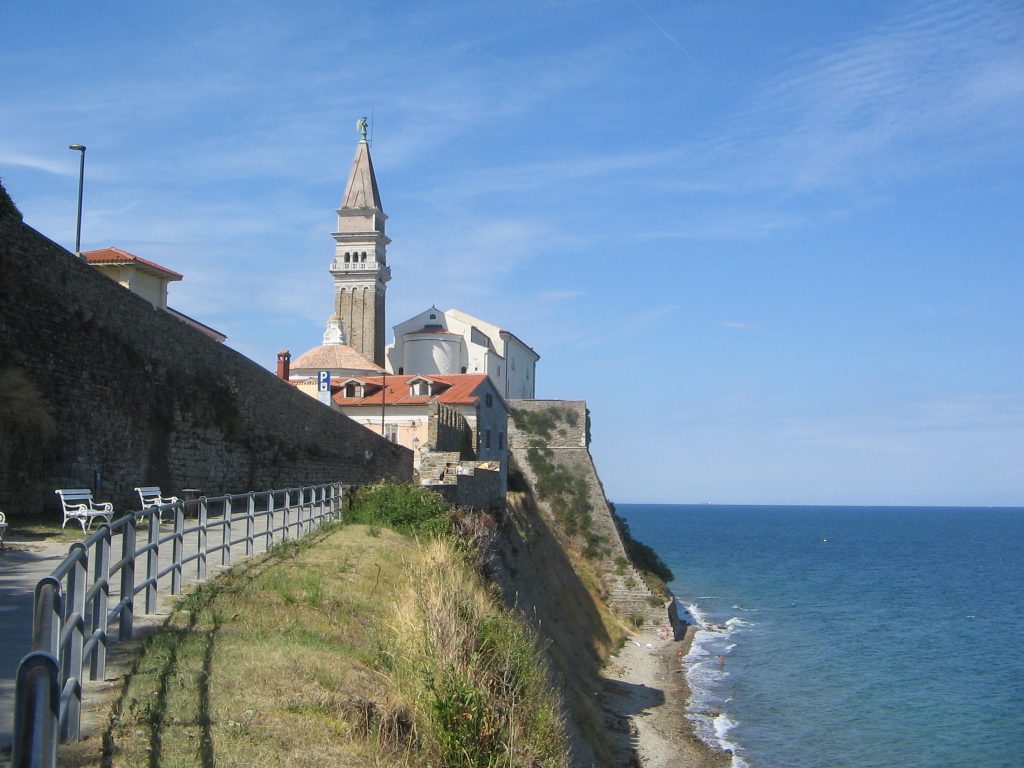 K sreči obrobje Pirana ponuja nekaj mirnejših kotičkov. Eden takšnih, kamor se lahko podamo tudi s psom, je med rtom Punta in cerkvenim obzidjem. Od tam se do zaliva v Fiesi nadaljuje kakšen kilometer neurejene obale. Ker je del pod cerkvenim obzidjem prehoden le ob najnižji oseki, se je običajno treba podati po poti, ki se od cerkve sv. Jurija pod klifom spusti do Fiese. Prodnati obalni pas je širok le nekaj metrov in posejan z velikimi skalami.