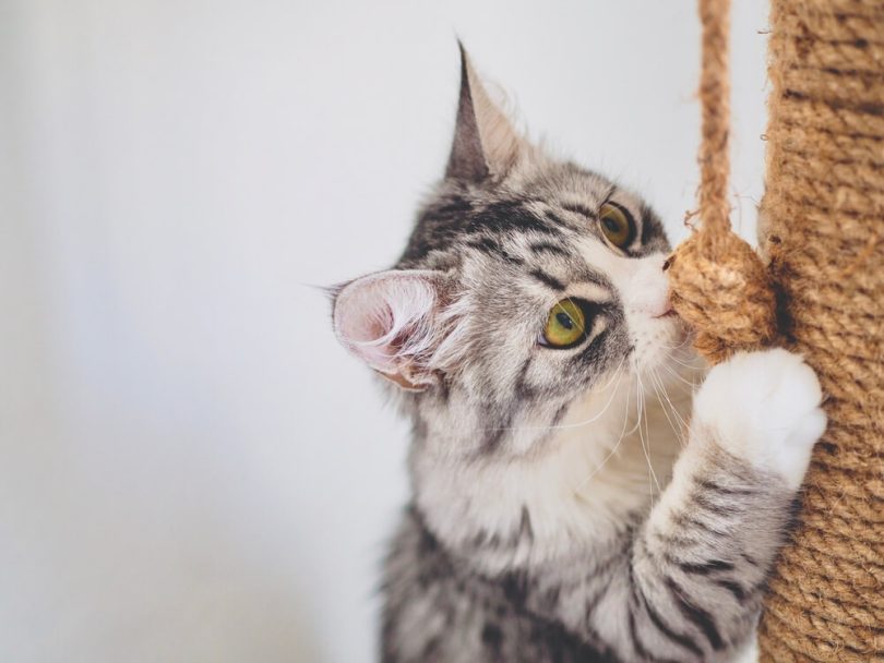 Če vaša mačka praska pohištvo in druge stvari, je to verjetno zato, ker ji niste zagotovili primernega praskalnika. Praskanje je normalno vedenje mačke. Tega ne počne zato, ker bi bila jezna na vas in bi se skušala “maščevati”, niti tega ne počne zato, ker ji ni všeč vaš okus za pohištvo. Zato zagotovite svoji mački praskalnik in jo spodbudite k uporabi. Praskalnik mora imeti navpične in vodoravne površine za praskanje.