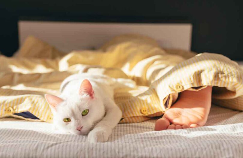Ko mačka spi na vaših nogah ali pri stopalih, vam jih greje, obenem pa lahko išče tudi vašo toploto. S tem, ko mačka spi pri vaših nogah je blizu vas, a ima tudi možnost varnega pobega – saj so noge ponavadi na robu postelje ali kavča.