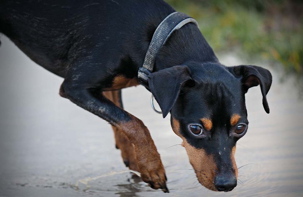Kratka, sijoča dlaka malega pinča skoraj ne vpija vode, zato se posuši v hipu. Zaradi majhne postave je še posebej priročen sopotnik za deževne mestne sprehode.