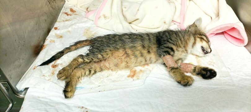 Mačka je bila kmalu za tem s strani zgrožene priče dogodka, še živa odpeljana na veterino, kjer je ponoči podlegla poškodbam.