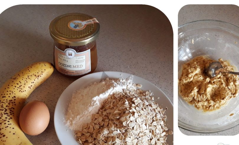 Pečico segrejemo na 180 °C. Banano pretlačimo, dodamo jajce, med in olivno olje. Ko premešamo, dodamo še ovsene kosmiče in moko. Z žlico oblikujemo majhne kupčke in jih polagamo na peki papir. Piškote pečemo okoli 12 minut.