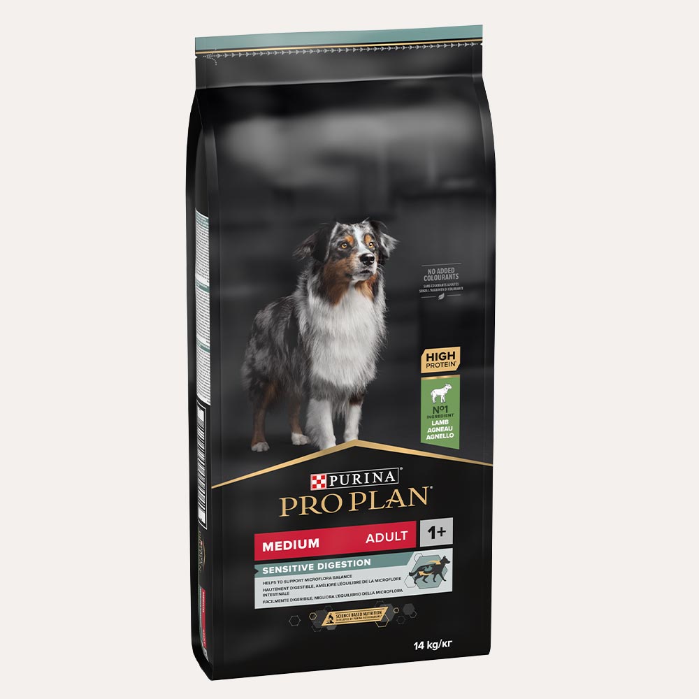 Če ima vaš pes občutljivo prebavo, je hrana PURINA® PRO PLAN® Sensitive Digestion o prebavljivih sestavin, ki olajšujejo prebavni proces. Vsebuje tudi tudi probiotike za boljše ravnovesje črevesne mikroflore.