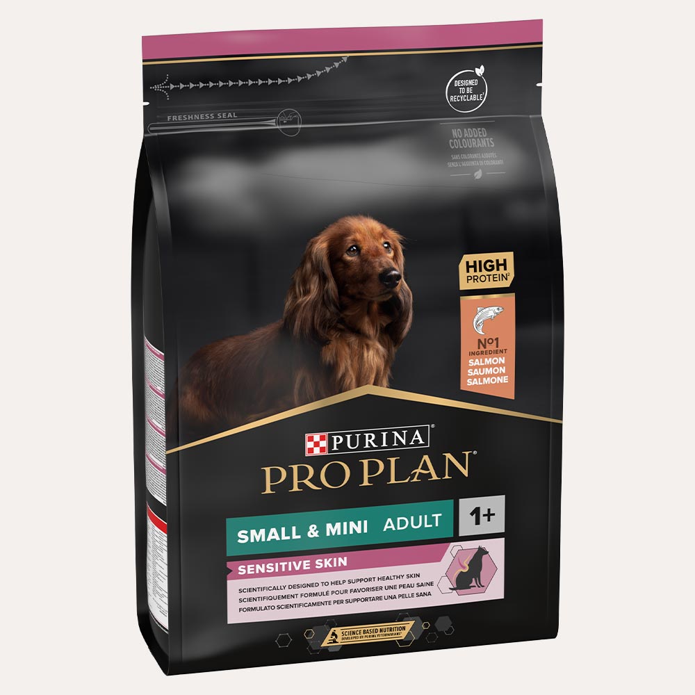 Pri psih z občutljivo kožo je izjemno pomembno, da izberemo znanstveno oblikovano hrano za vzdrževanje zdrave kože in sijoče dlake. Hrana PURINA® PRO PLAN® Sensitive Skin je skrbno formulirana iz visokokakovostnih koščkov lososa kot prve sestavine in izbranih dodatnih virov beljakovin ter je popolnoma brez pšenice.