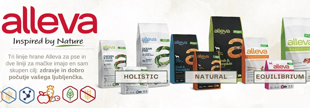 Glede na različne prehranske potrebe in filozofije ima Alleva tri linije hrane za pse in dve za mačke. Gre za celostno naravnanost linije. Alleva Holistic oživi zahvaljujoč učinkoviti mešanici fitonutrientov, ki jih odlikuje visoka funkcionalna aktivnost. Alleva Natural vsebuje dehidrirano bučo, ki spodbuja dobro delovanje črevesja, funkcionalnosti vitalnih tkiv in je učinkovita podpora sklepom. Allevo Equilibrium pa odlikujejo izbrani viri beljakovin in visoko prebavljivih ogljikovih hidratov, ki skupaj z dodatkom sadja in zelenjave poskrbijo za dobro prebavo in počutje vašega ljubljenčka.