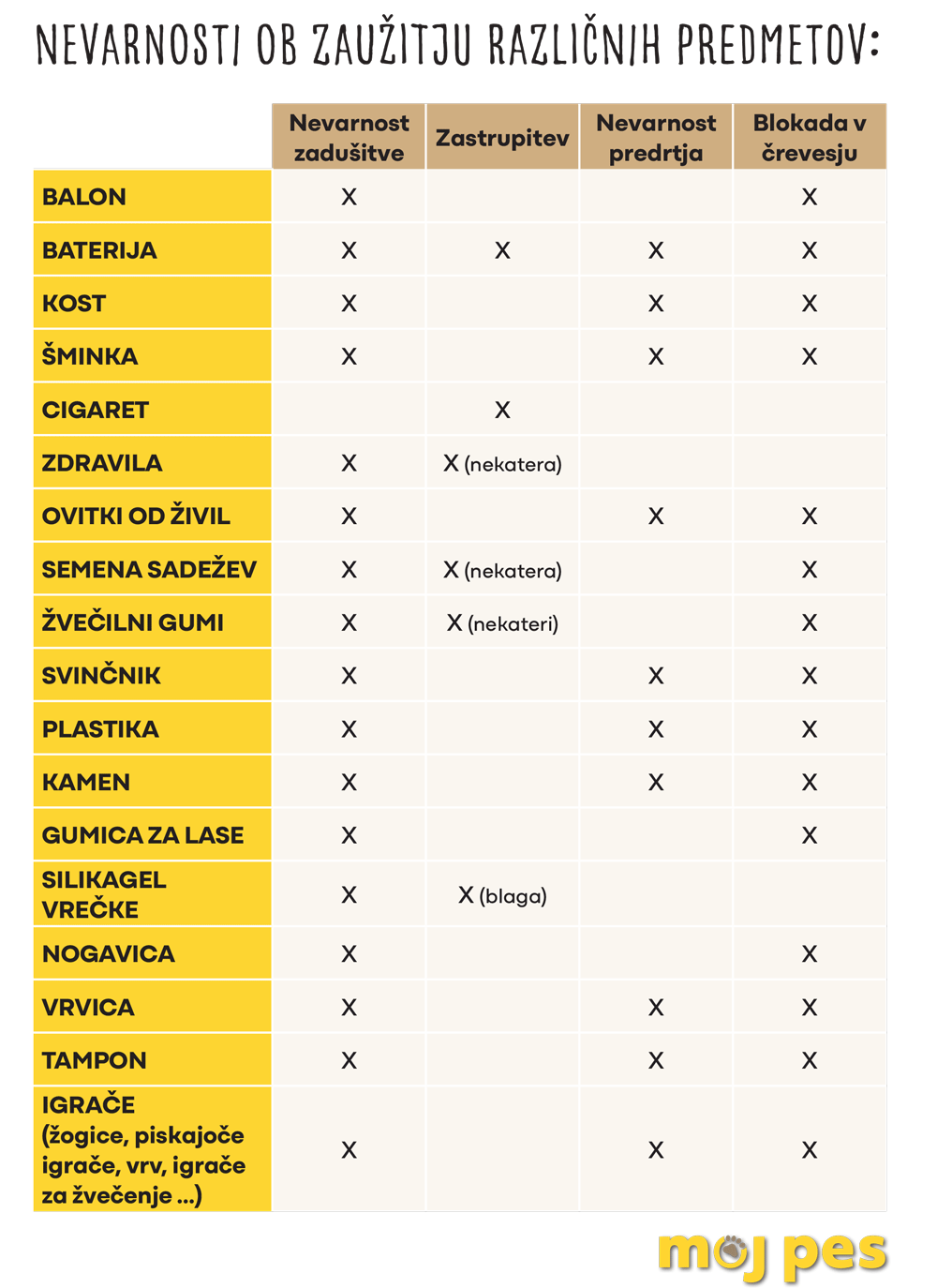 Nekateri predmeti so morda dovolj majhni in neškodljivi in jih psi izločijo brez večjih težav, a lahko se zgodi, da pes pogoltne tudi kaj strupenega, kaj, kar se nekje na poti v prebavnem traktu zatakne in povzroči težave.