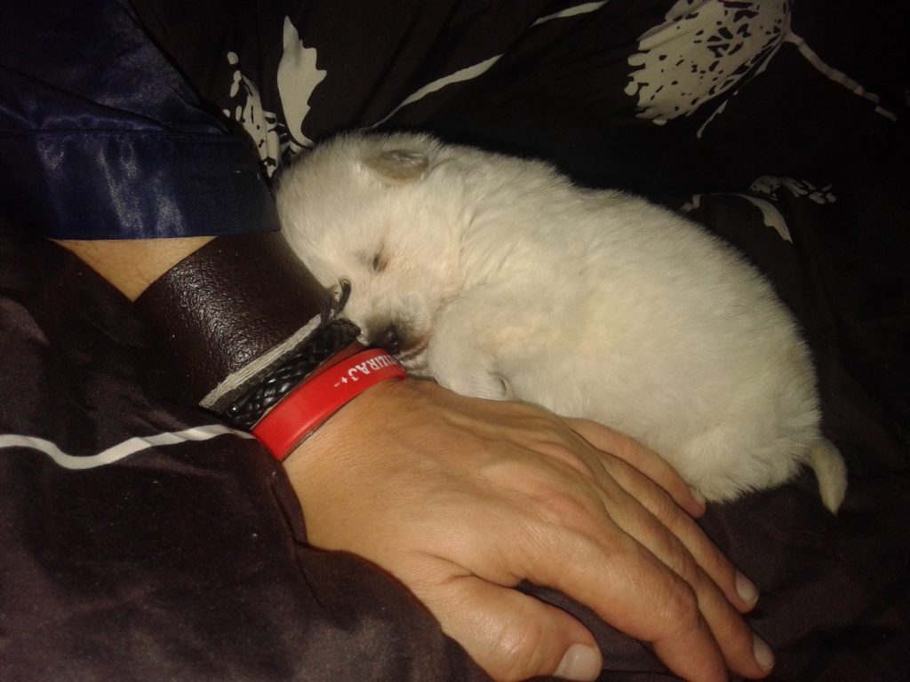 Luna je čisto domača kužika; je od moje prejšnje psičke, zlate prinašalke Emite. Ta je imela dve legli in potem se kar naenkrat pri šestih letih ni več hotela spariti. Tako so minila štiri leta. Nekega dne pa je k nam prišel sosedov samojed, ki nam je raztrgal ograjo. In to je bilo to! Med četrtim in petim tednom, ko so se povečali seski, sem ugotovila, da je psica breja. Tri dni kasneje je skotila, štiri mrtve mladiče, ki so tehtali okoli 300 gramov, in živo psičko, našo Luno, ki je imela samo 110 gramov. Mama jo je od prvega trenutka zavračala, nikakor je ni hotela sprejeti. Čez dva dni je Emita padla v sladkorno komo in žal smo jo izgubili. Za njo pa je ostala majhna kepica, velika za dlan, za katero se je kasneje izkazalo, da je slepa, oz. da sploh nima oči. Toda v prvih tednih to sploh ni bilo bistveno; najprej smo se borili za njeno preživetje.