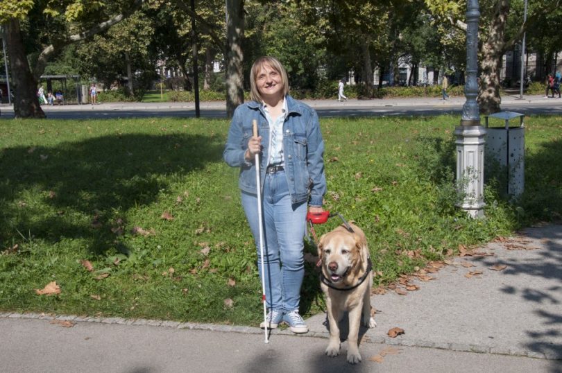 »Kora hodi lepo ob meni, jaz pa pazim da ne pade čez stopnice in pločnike ter na to, da se ne zaleti v druge ovire.«